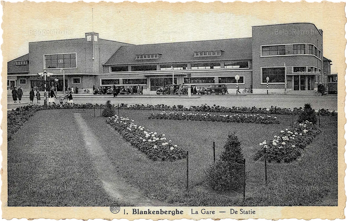 La nouvelle station de Blankenberge. Blankenberge. Het nieuw station. Blankenberge. The new station. Blankenberge. Der neue Bahnhof. Société Nationale des Chemins de fer belges Nationale Maatschappij der Belgische Spoorwegen Belgian National Railways Nationalgesellschaft der Belgischen Eisenbahnen P. I. B. , rue des Etangs-Noirs, 83-85, Brux.